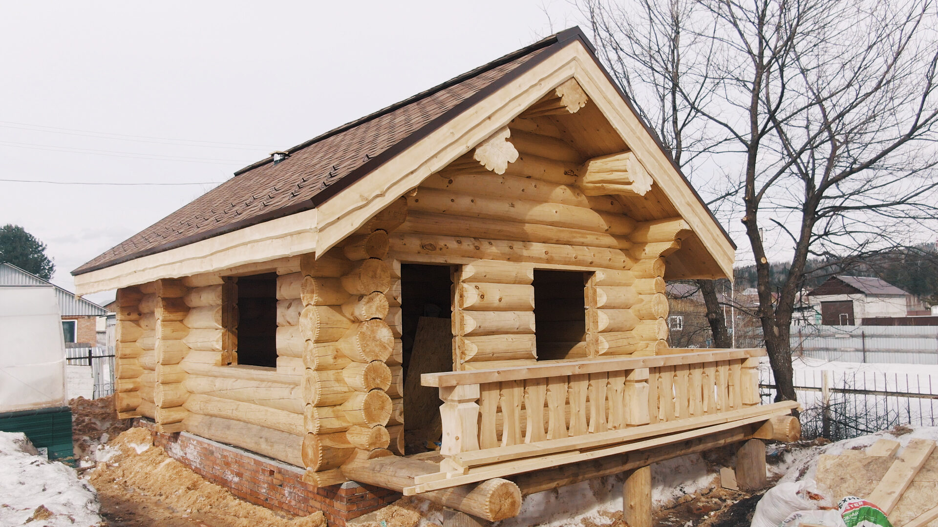Баня выполнена по канадской технологии из сибирского кедра диаметром 320-360 мм. Общая площадь составляет 50 м2.