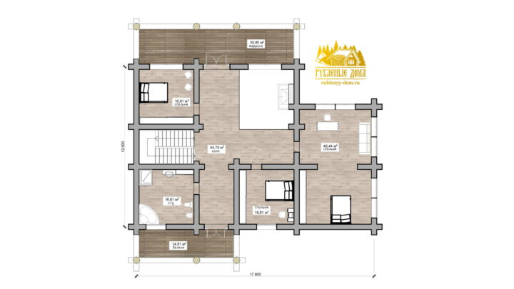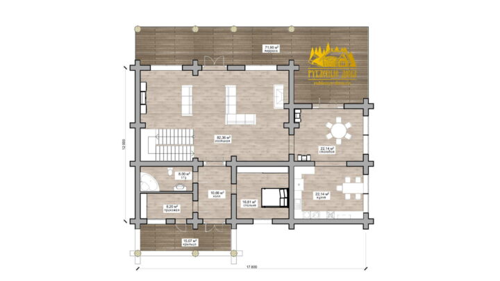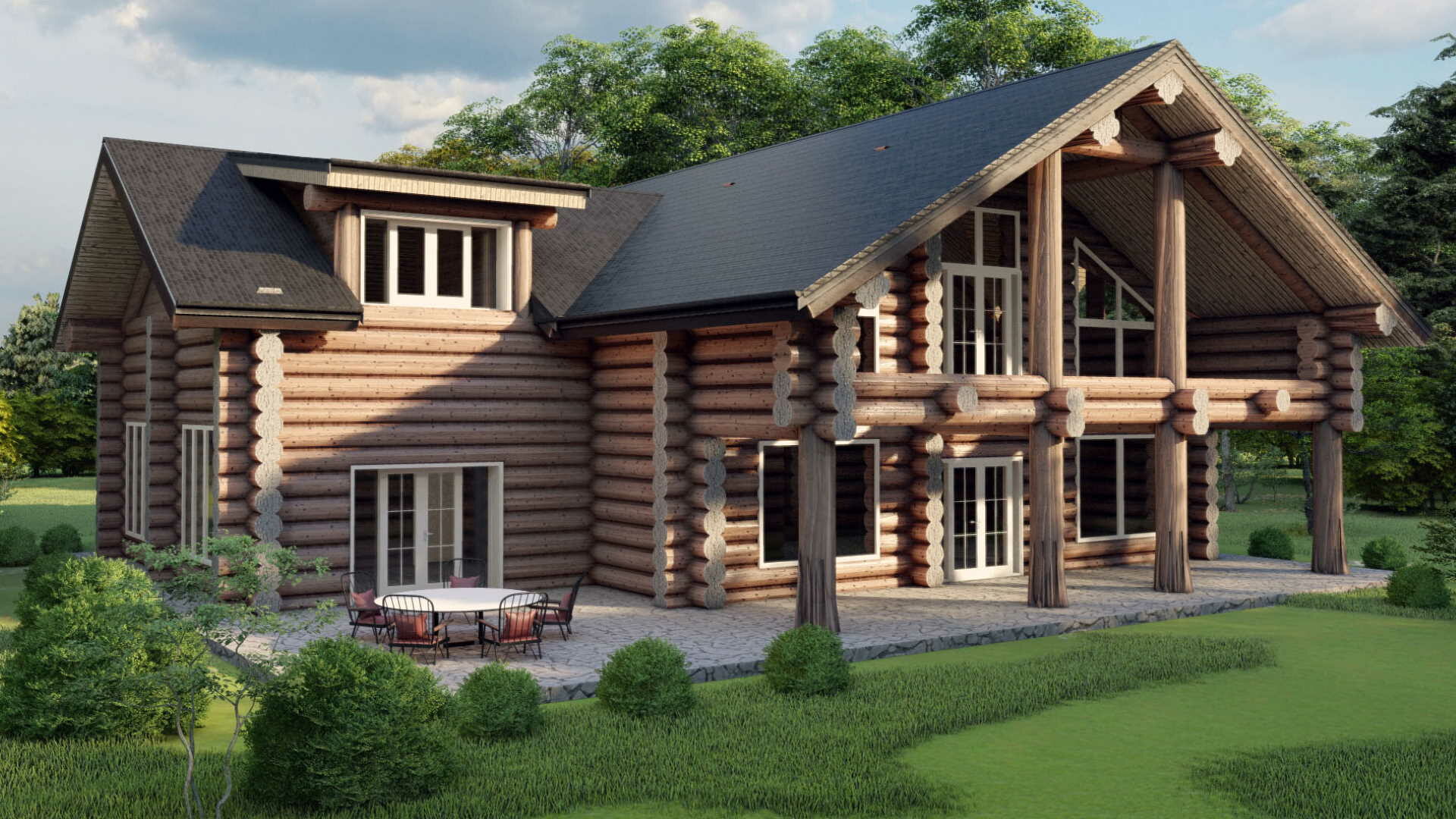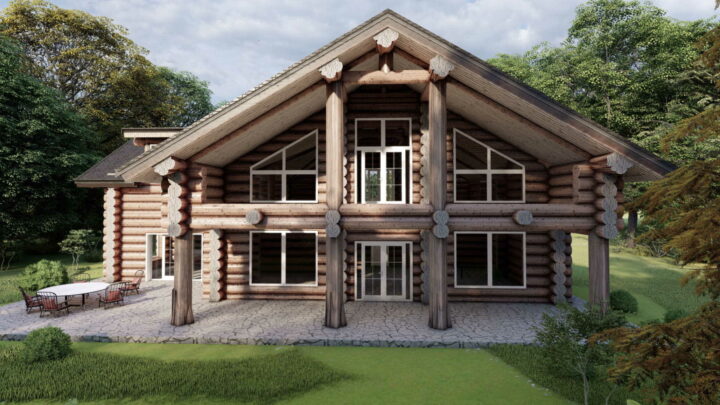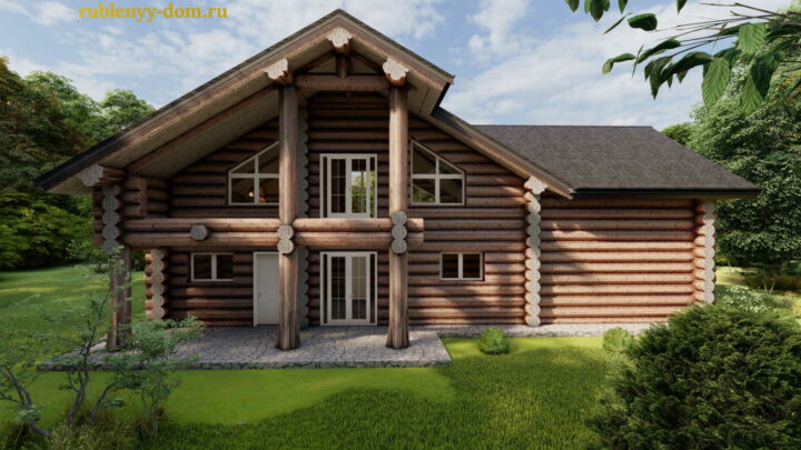 Просторный двухэтажный дом с большой террасой и балконами, дает возможность почувствовать всю мощь и величие деревянного строения. Кухня и столовая расположены в разных зонах, при этом объединены в одно помещение, что позволяет визуально создать большое и открытое пространство. Конструктив выполнен по технологии ручной рубки «канадская чаша», диаметр бревна 340-380 мм, порода древесины «сибирский кедр»