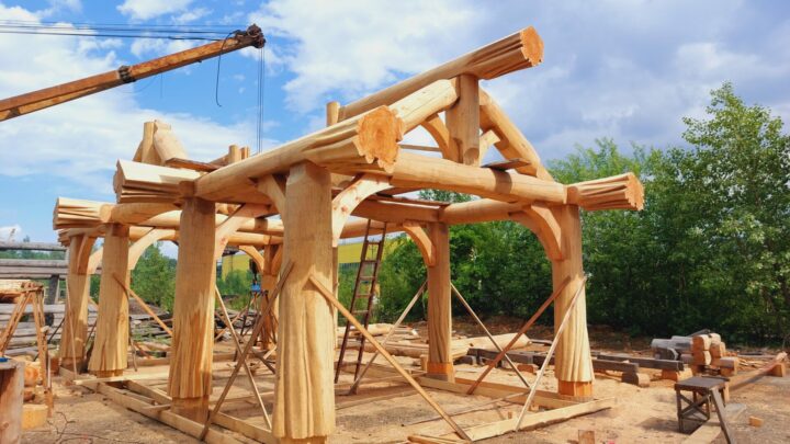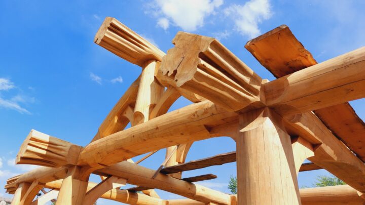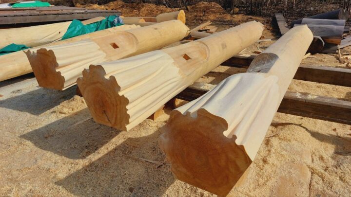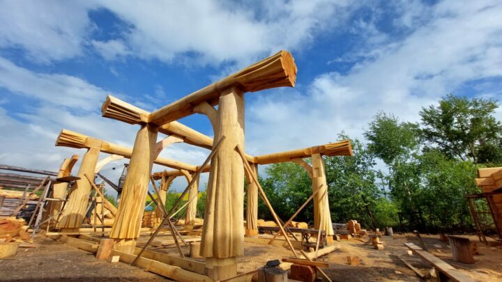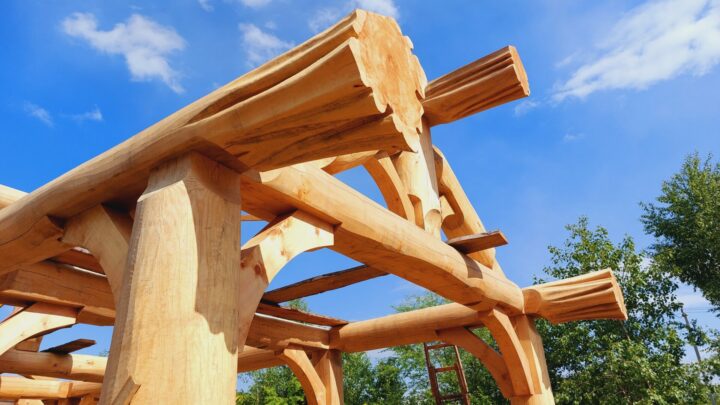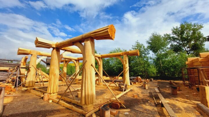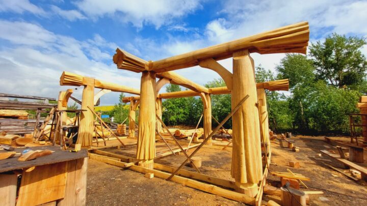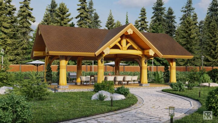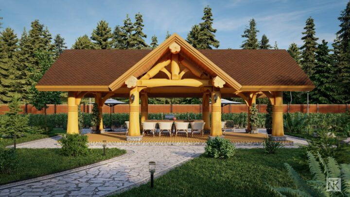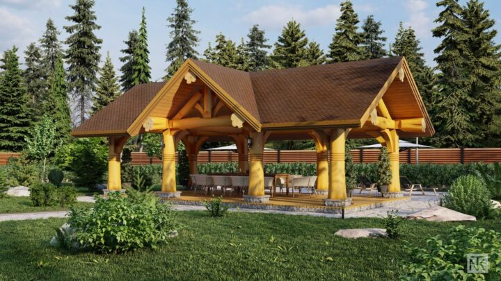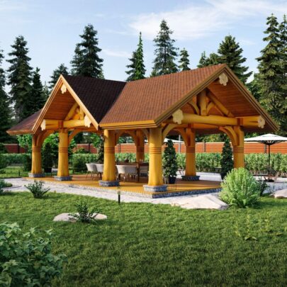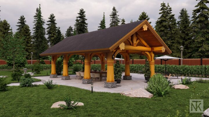 Беседка «Хенрис-Форк» выполнена из древесины большого диаметра и имеет оригинальный внешний вид.