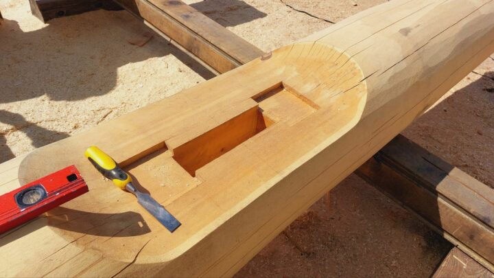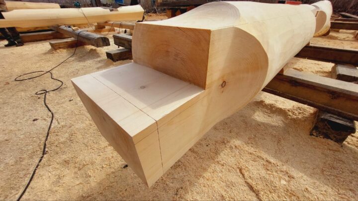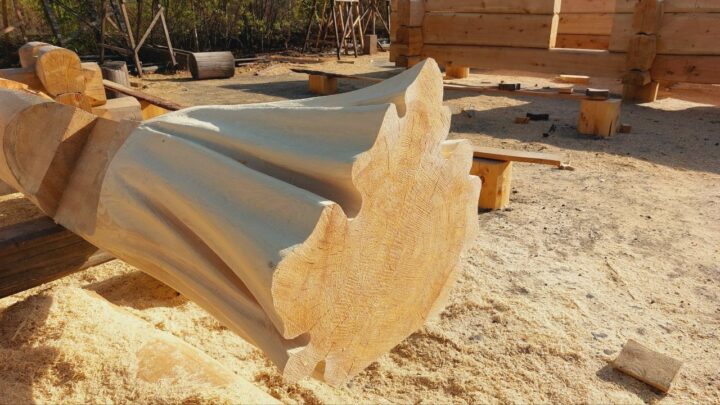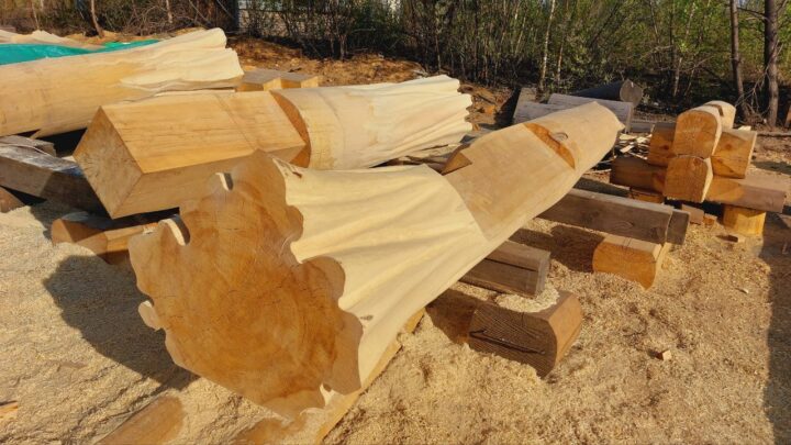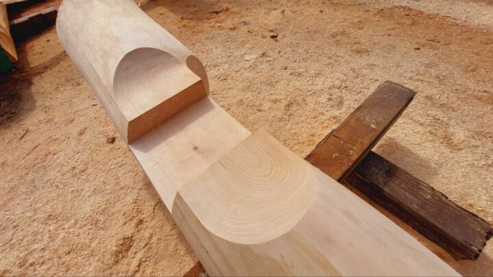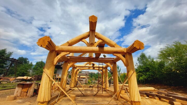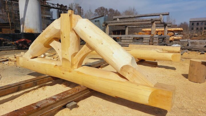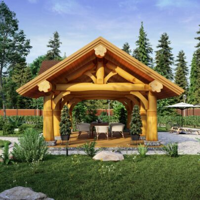 Беседка выполнена по технологии Post&Beam. Все стойки и балки беседки выполнены из цельных бревен минимальной обработки, благодаря примененной технологии беседка выглядит очень необычно и не стандартно. Беседка возводилась без применения гвоздей, в бревнах выпиливались пазы и шипы нужной формы и впоследствии каркас собирался как конструктор. Поэтому постройку сооружений по технологии Post&Beam нужно доверять только мастерам своего дела, ведь ценой ошибки будет испорченный ствол дерева, подобранный для проекта.
