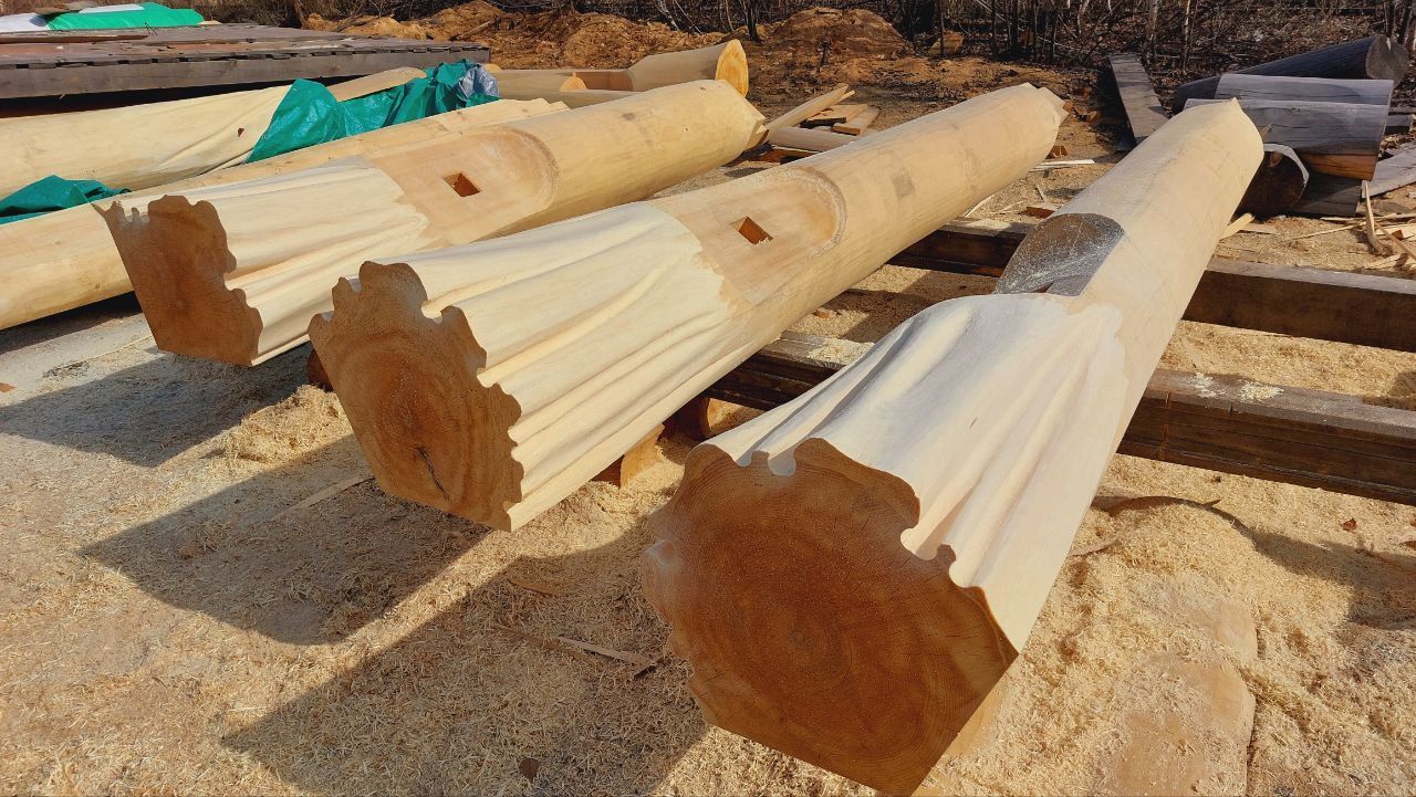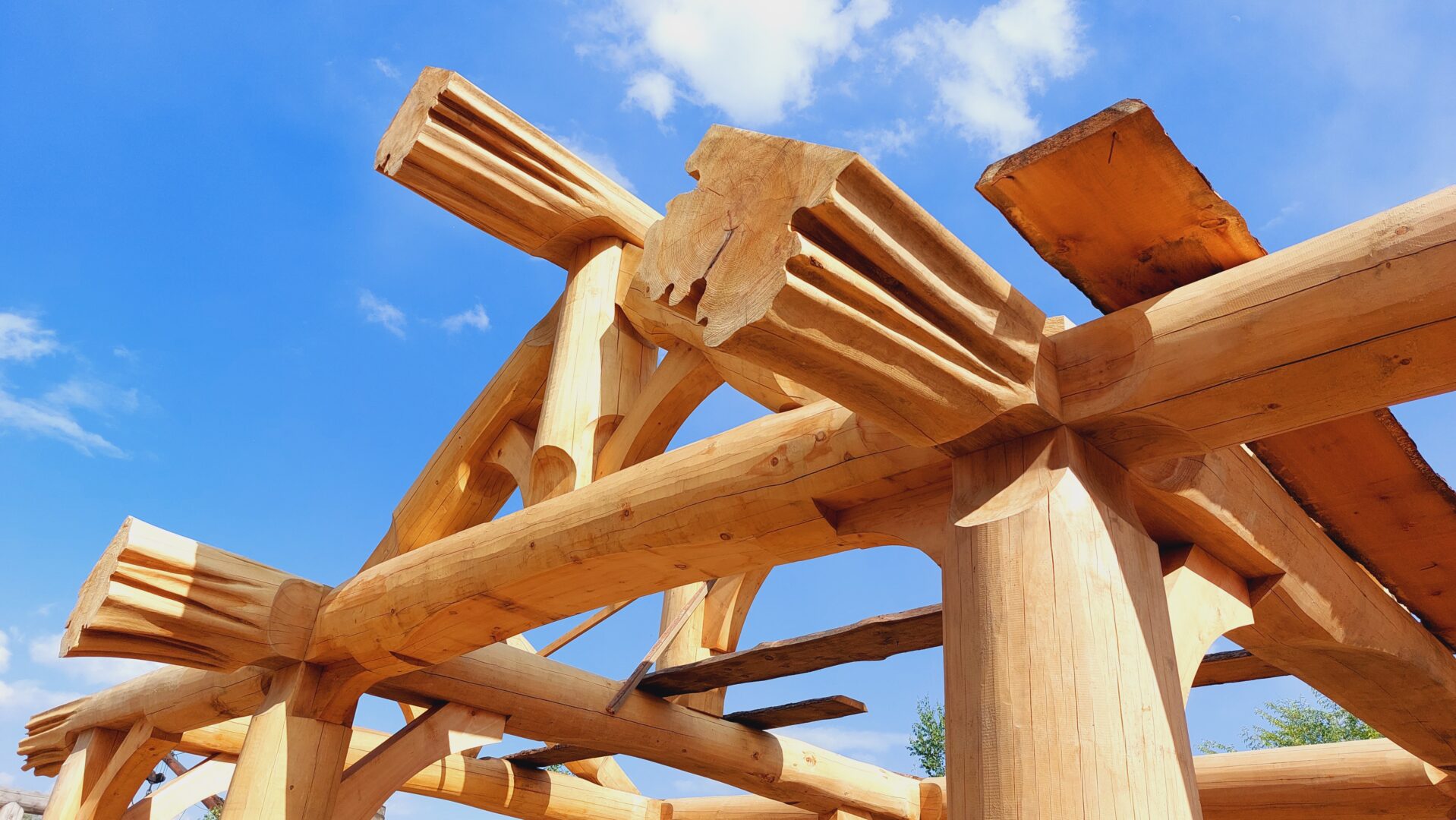 Беседка выполнена по технологии Post&Beam. Все стойки и балки беседки выполнены из цельных бревен минимальной обработки, благодаря примененной технологии беседка выглядит очень необычно и не стандартно. Беседка возводилась без применения гвоздей, в бревнах выпиливались пазы и шипы нужной формы и впоследствии каркас собирался как конструктор. Поэтому постройку сооружений по технологии Post&Beam нужно доверять только мастерам своего дела, ведь ценой ошибки будет испорченный ствол дерева, подобранный для проекта.