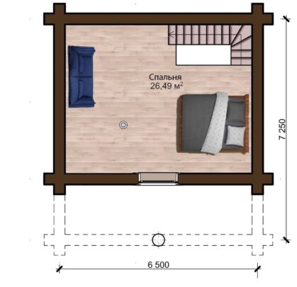 На втором этаже расположена просторная спальня площадью 26,49 м2. Для того чтобы на втором этаже было достаточно света – дополнительные окна встроены в крышу.
