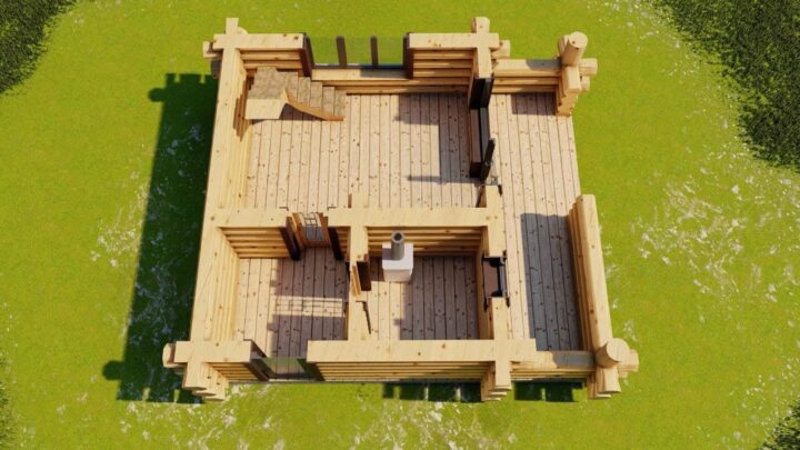 На первом этаже бани расположена моечная с парной, комната отдыха и веранда, на втором этаже – спальня. В комнате отдыха можно разместить стол со стульями и кухню, площадь комнаты в 17,8 м2 позволяет это сделать.