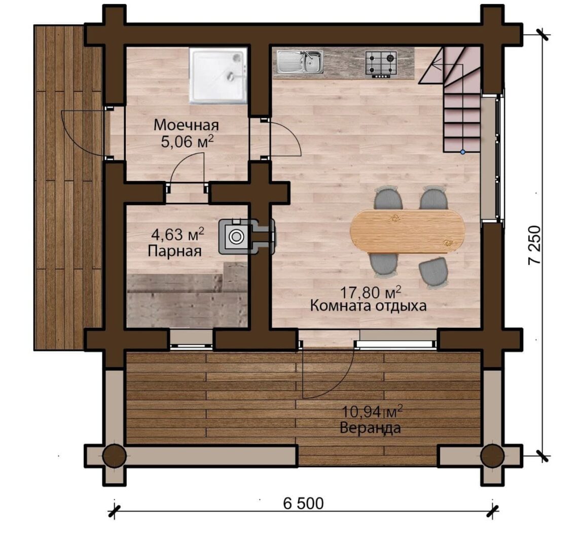 На первом этаже бани расположена моечная с парной, комната отдыха и веранда, на втором этаже – спальня. В комнате отдыха можно разместить стол со стульями и кухню, площадь комнаты в 17,8 м2 позволяет это сделать.