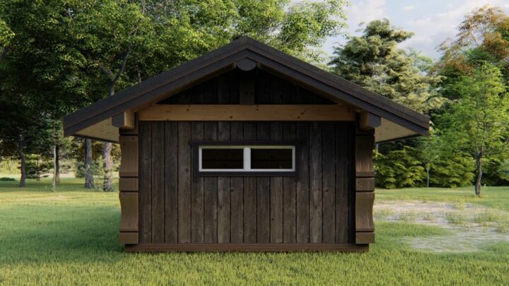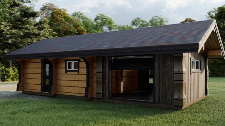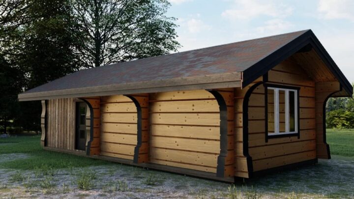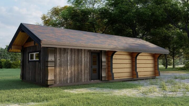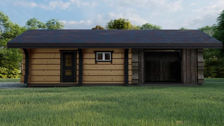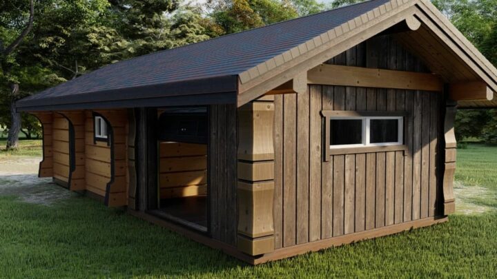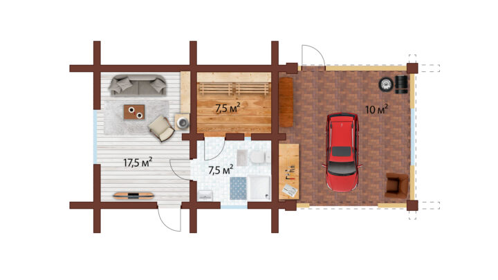 Имеет нестандартную планировку: под одной кровлей с баней располагается гараж на одну машину. Общая площадь составляет 42,5 м2.