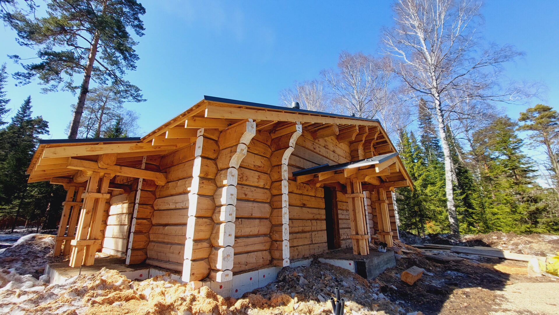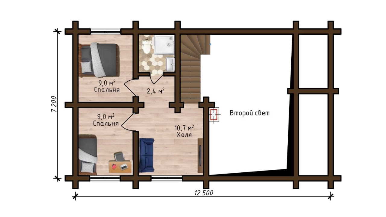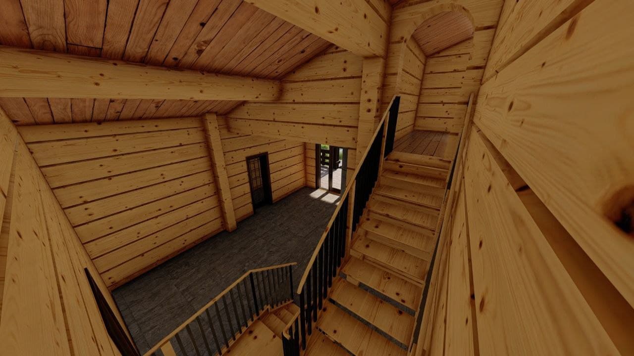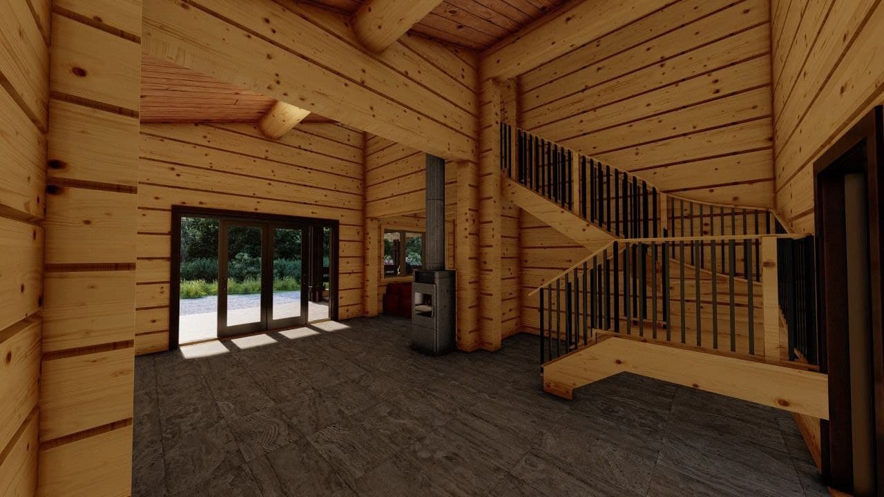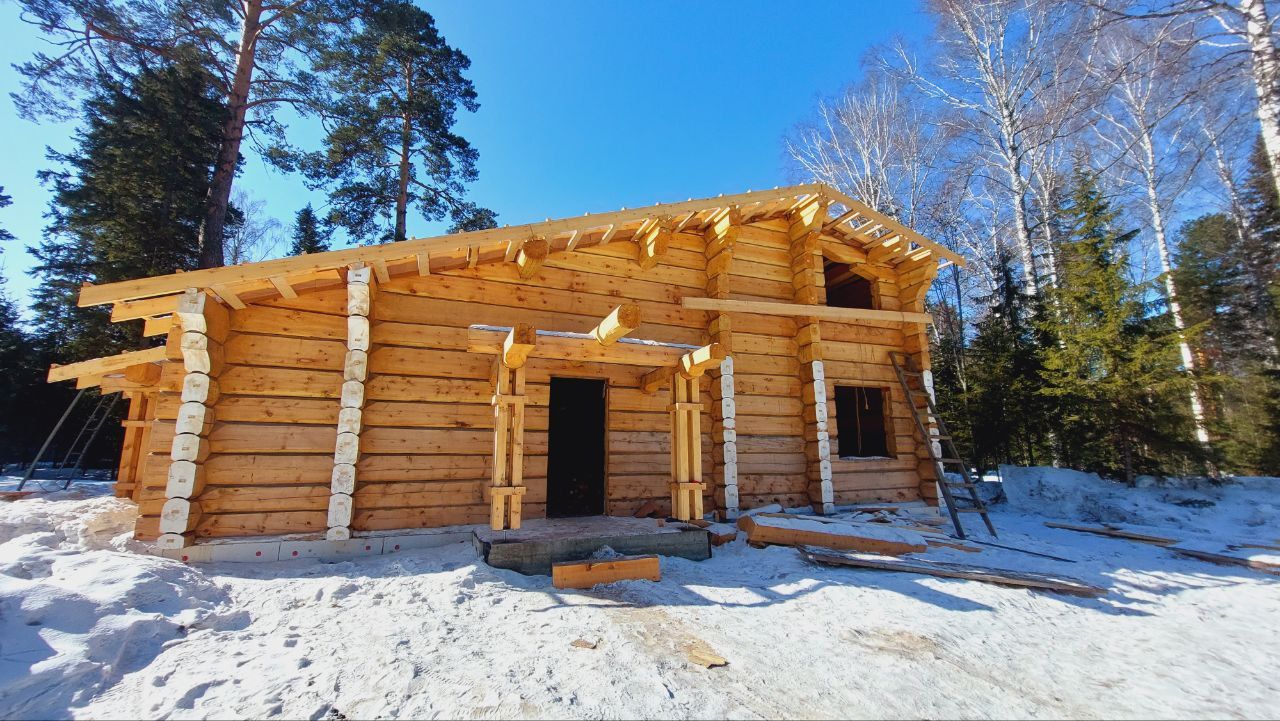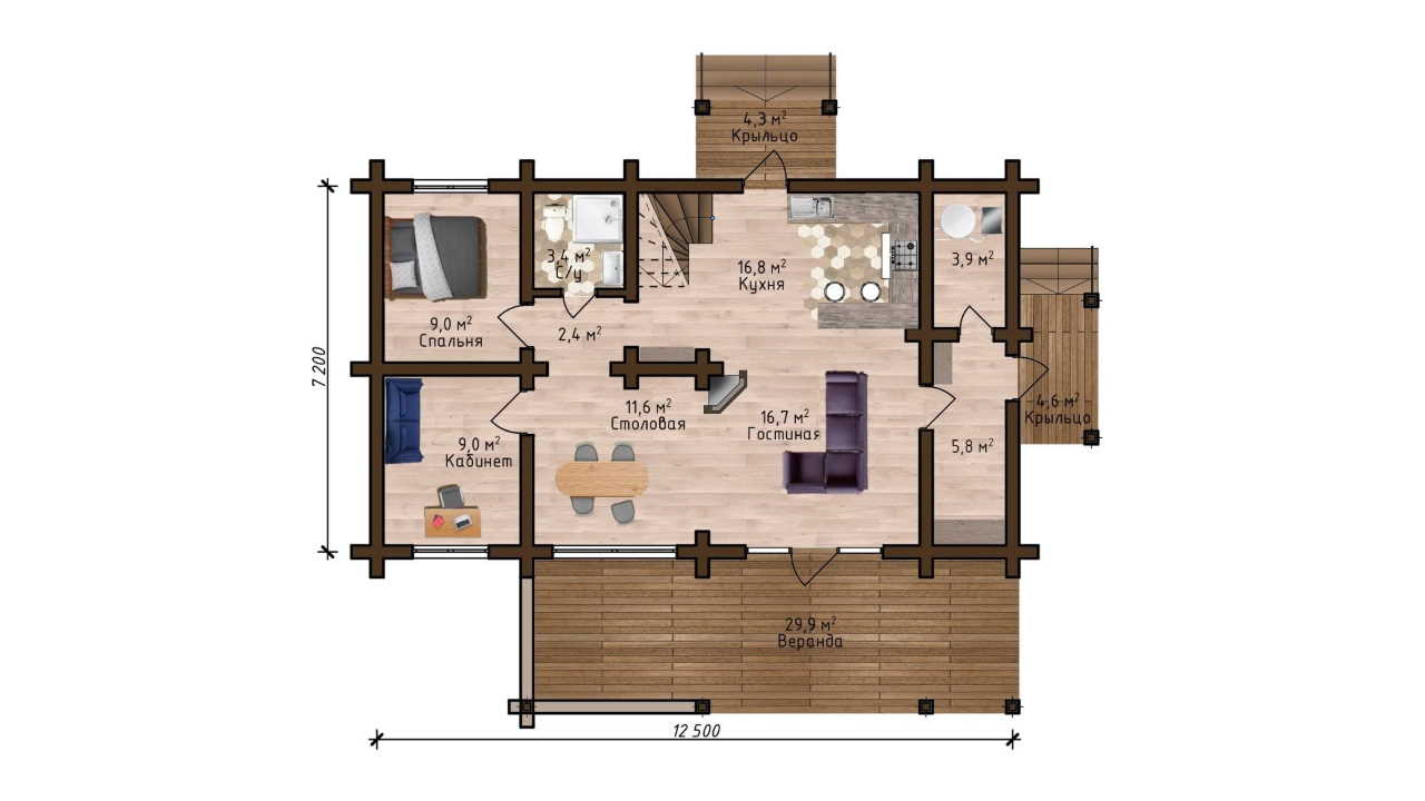 Загородный дом общей площадью 150 м². Разработан индивидуально учитывая все пожелания заказчика. Зонирование в планировке позволяет разместить всю необходимую мебель, создавая этим особую атмосферу и неповторимость. Наличие второго света над кухней и гостиной наполняет помещения дополнительным воздухом, обеспечивая комфортное проживание в любое время года. Предусмотрено большое панорамное окно с дополнительным выходом на веранду с видом на сад. Конструктив сруба изготовлен по норвежской технологии рубки из лафета (двухкантного бруса), высота в вершинах составляет 400-440 мм, толщина стен 250 мм.